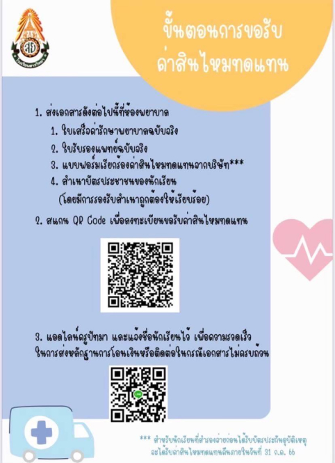 5.2 ในรายที่ได้รับอุบัติเหตุเบิกค่าประกันได้ไม่เกิน 10,000 บาท เนื่องจากมีประกันค่ารักษาพยาบาลเมื่อเกิดอุบัติเหตุที่นักเรียนทำไว้กับทางโรงเรียนโดยขอใบรับรองแพทย์และใบเสร็จมาทำเรื่องเบิกที่ห้องบริหารจัดการ
